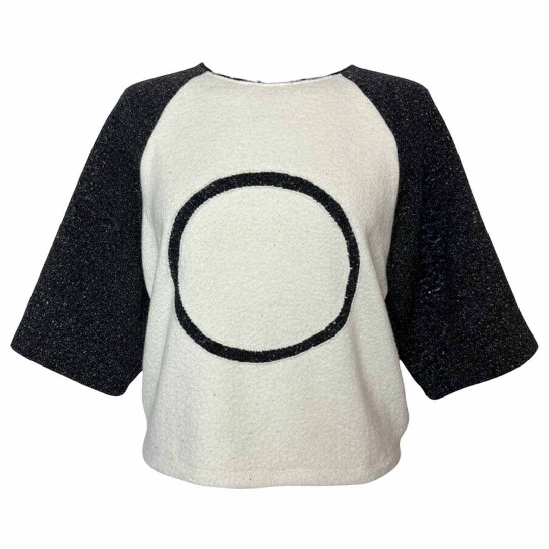 De Grey Ecru Circle top combineert een sportieve uitstraling met de ongeëvenaarde luxe van zijde en wol. Dit opvallende tweekleurige design met grafische elementen is een comfortabele en stijlvolle toevoeging aan de collectie van CLAU-D, perfect voor de moderne, bewuste vrouw.